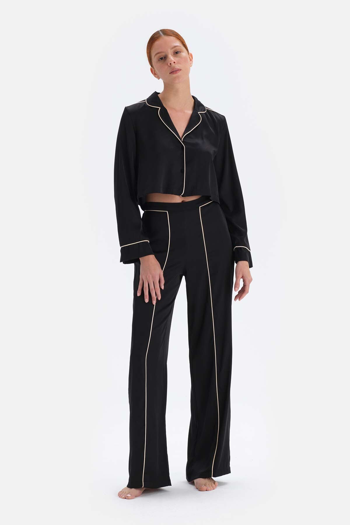 Siyah biye ayrıntıları olan pijama takımı rahat bir uyku çekmenizi sağlar. Normal bel alt ve gömlek yaka üst parçadan oluşan takım saten şıklığına ayrı bir zarafet katar. Kullanım talimatlarına uyun temizleme uzun süreli saten şıklığına sahip olmanızı sağlar.
