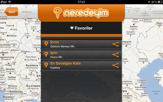 Uygulama, benzerlerinden farkl? olarak kullan?c?n?n gidece?i yeri de k?sa mesaj servisi, e-posta, Twitter ve Facebook yoluyla payla?mas?na olanak sa?l?yor.