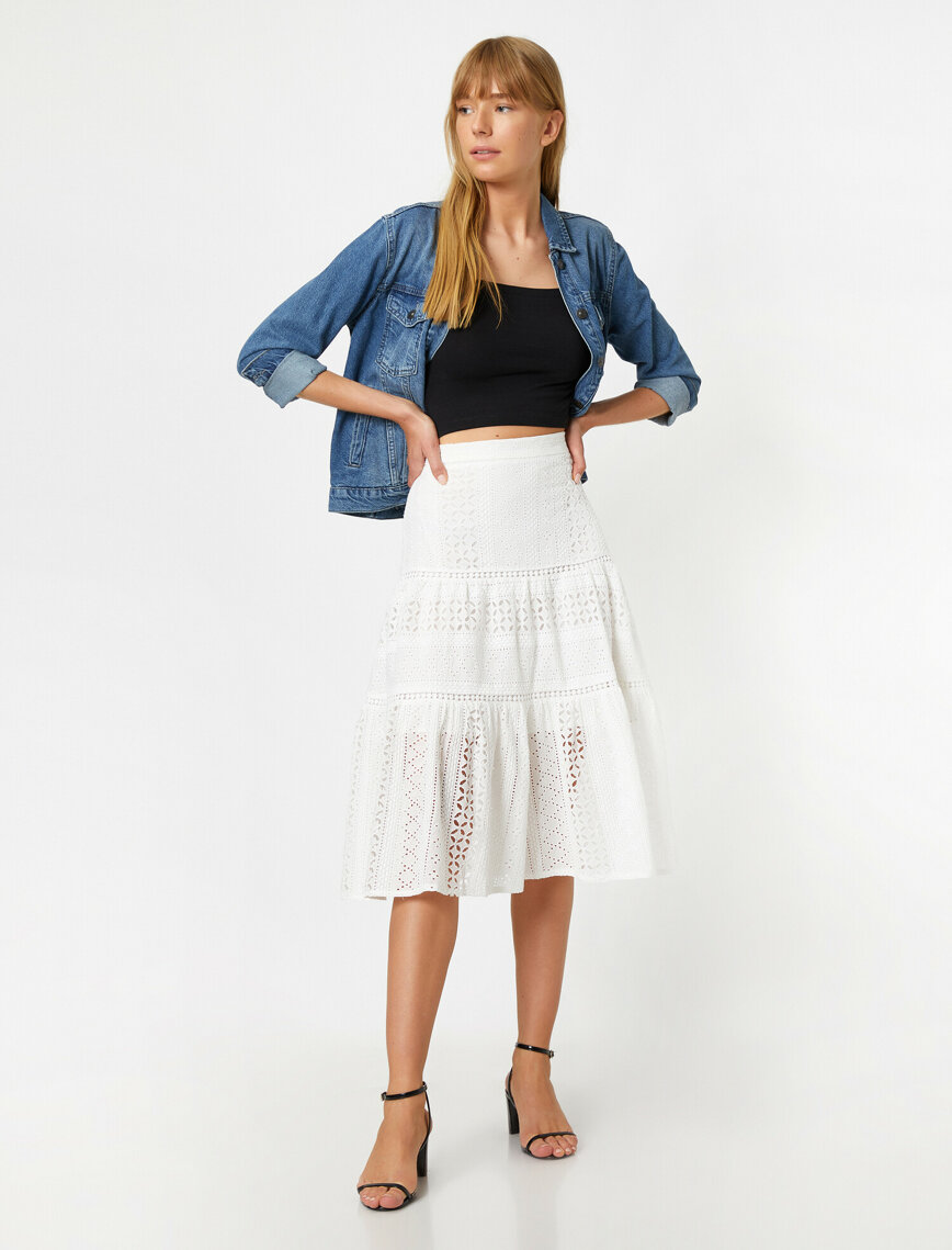 Bu eteği görür görmez aşık olduğunuza eminiz. Çünkü biz de öyle oldu. O kadar sade o kadar farklı, o kadar rahat ama bir o kadar da şık olan yüksek bel midi etek sayesinde yaza damganızı vuracağınızı rahatlıkla söyleyebiliriz. Hem kumaşı hem de kumaşında bulunan işlemeleri ile zarif ve şık duran bu etek gündelik kullanım için oldukça uygun. İster spor isterseniz de şık giyinin, bu etek her iki tarzı da rahatlıkla kaldırır.